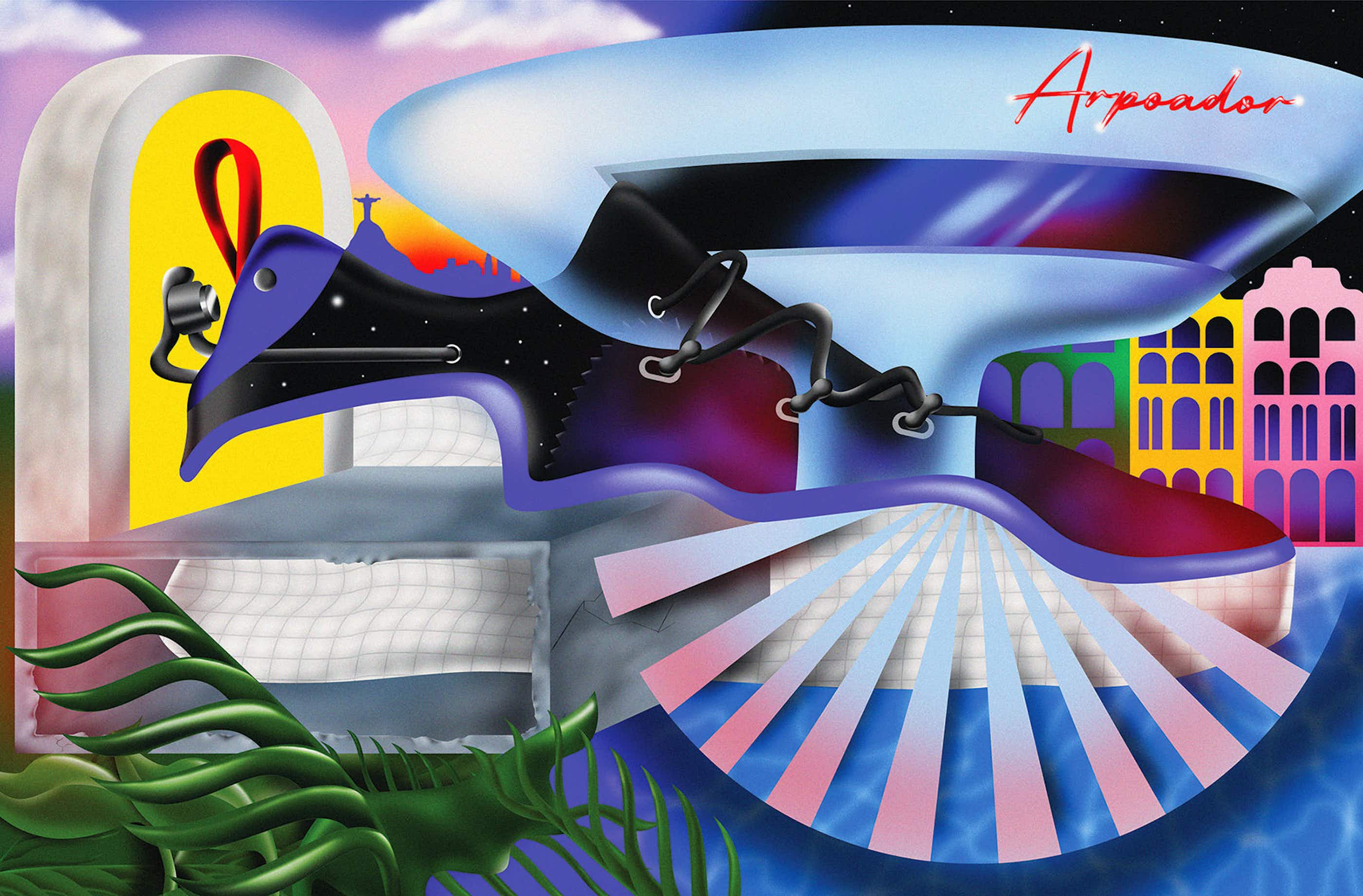 “The main building I referenced was the Niteroi Art Museum by Oscar Neimeyer,” Dyson says, referencing the space-age structure which dominates her image and morphs seamlessly into the undulating silhouette of the shoe”