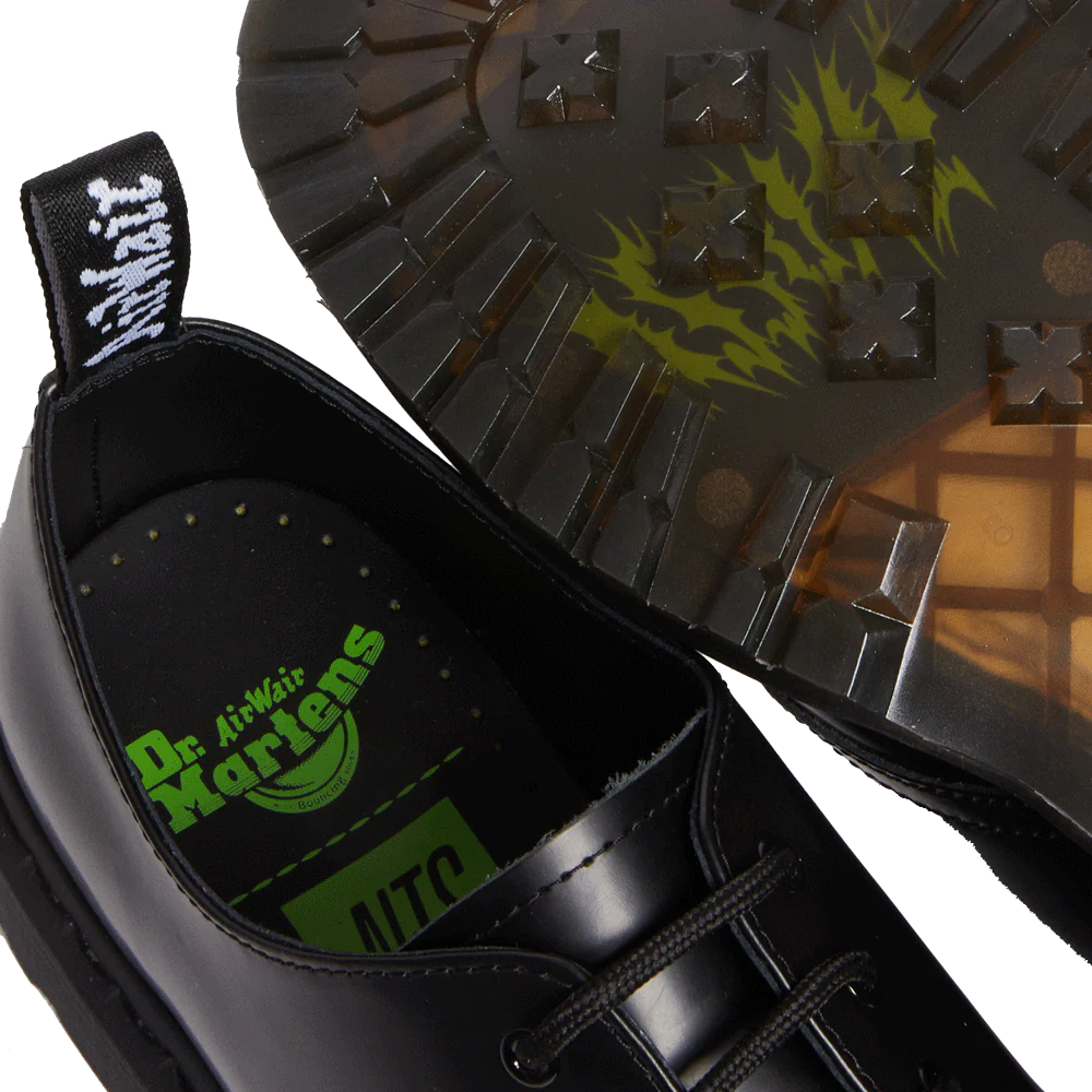 Typography for collaboration between NTS Radio and Dr Martens for a limited edition 1416 black leather shoe.